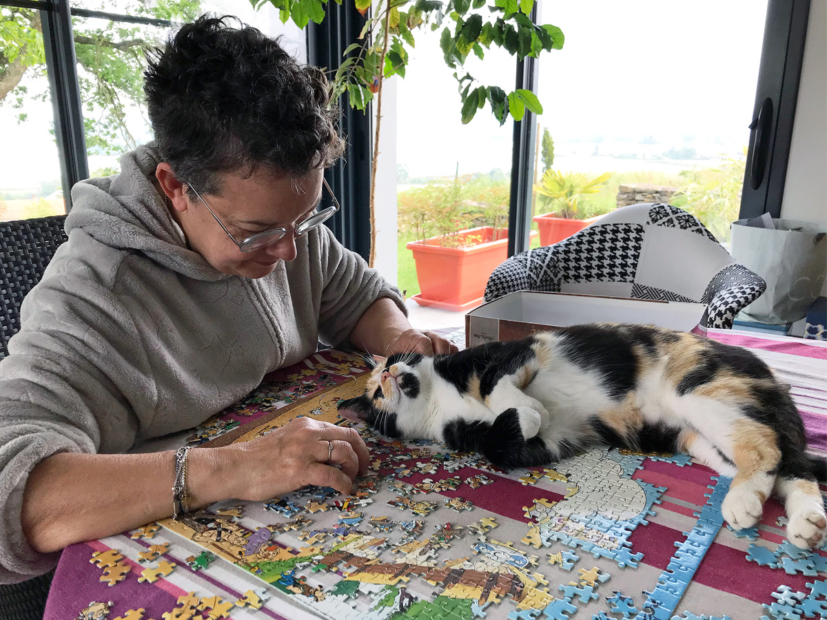La maison lui plait bien, les siestes se succèdent, elle apprend très vite les ficelles, les cachettes, les jeux, et puis rapidement on s'aperçoit qu'elle nous suit partout, s'intéresse à tout ce que l'on fait, que ce soit du jardinage, du bricolage, de la musique, de la couture, des puzzles...