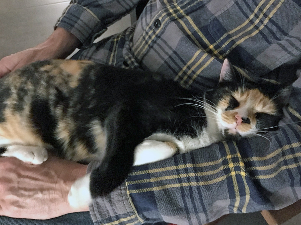 Après ce bon repas, petit repos sur les genoux de Sophie, histoire de faire connaissance. Visiblement, elle n'a pas peur des humains, ell semble même assez câline. Comme il nous reste quelques jours avant de remonter sur Nantes, on achète un paquet de croquettes, et on nourrit donc cette petite chatte pendant deux ou trois jours, en se forçant à ne pas s'y attacher car nous avons très régulièrement la garde d'un chat de notre fils, à Nantes.