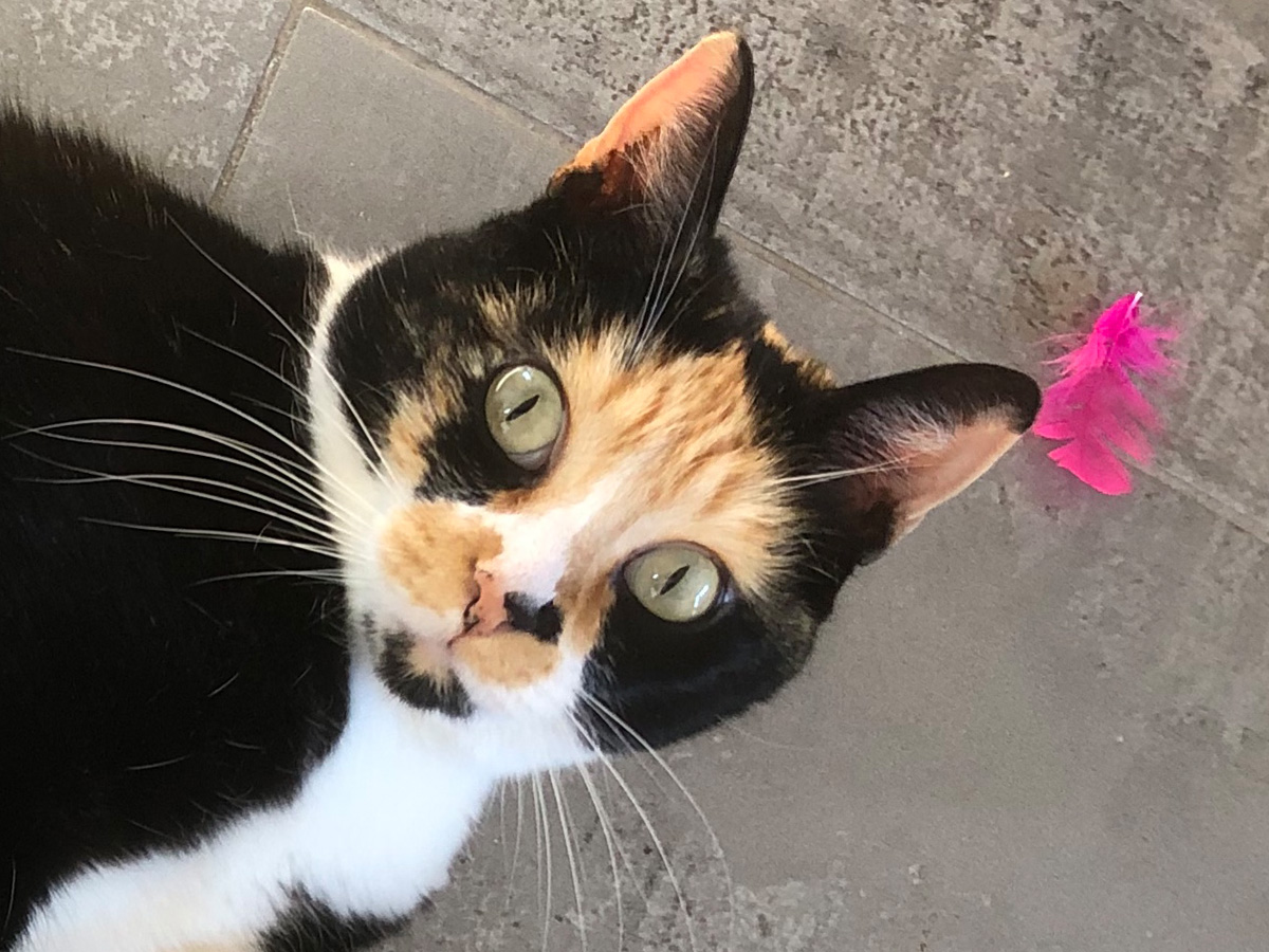 Nous découvrons donc de près cette chatte (sa couleur dite "isabelle" ou "calicot" ne laisse planer quasiment aucun doute sur son sexe, les chats de 3 couleurs étant à peu près tous des chattes), au ventre creux, au coussinets un peu usés - il faut dire que la maison est assez loin de toute autre habitation, et que ce chat avait du parcourir un certain nombre de kilomètres, peut-être deux ou trois, avant d'arriver devant chez nous.