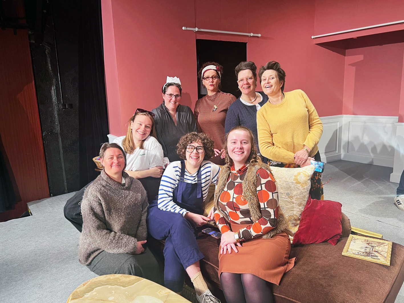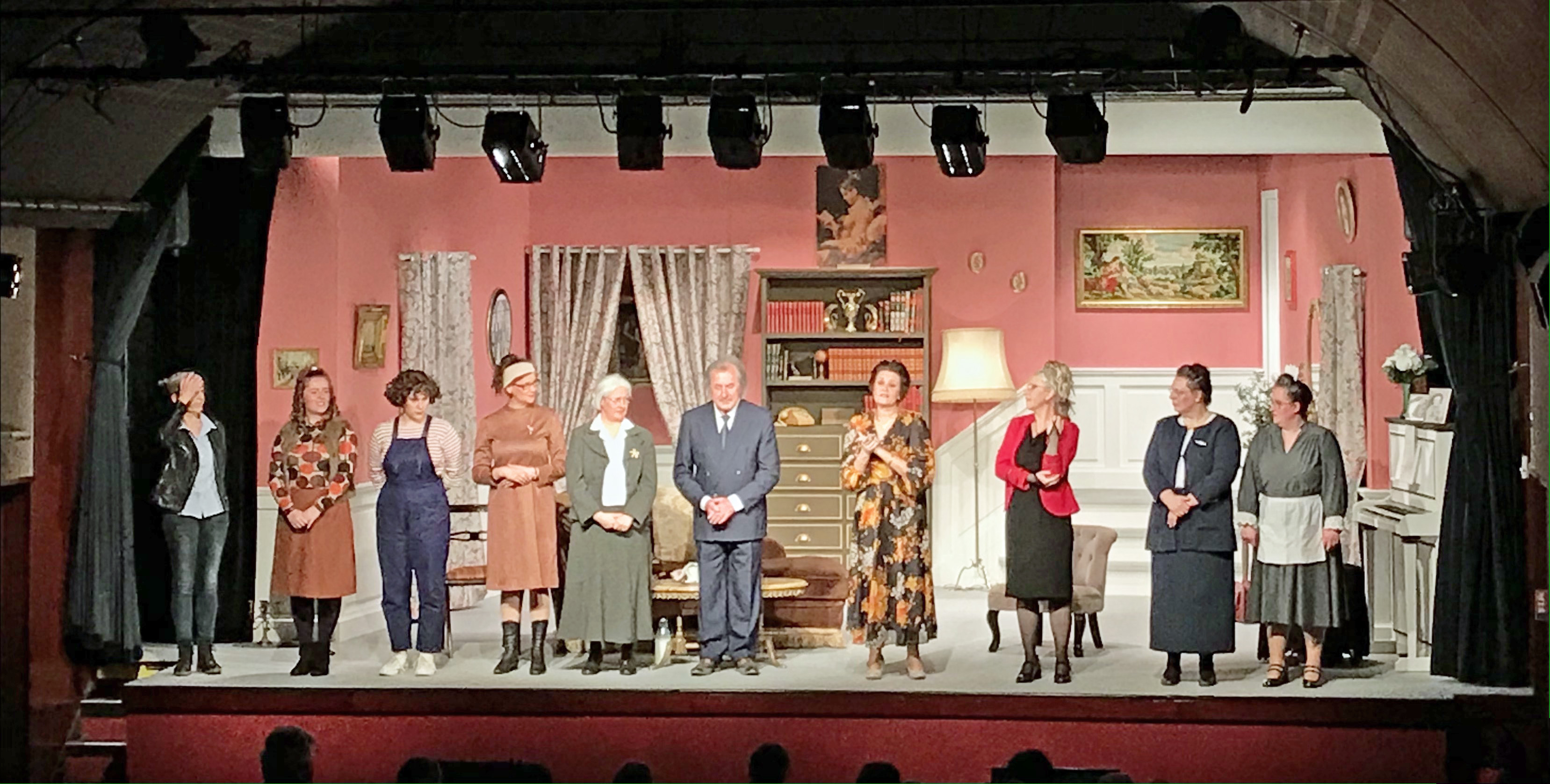 8 femmes, auxquelles on a rajouté un petit rôle pour un homme : Gilles, qui joue depuis... 50 ans dans la troupe. Petite adaptation pour la scène finale, où le père apparait donc quelques minutes, écoutant un long monologue. Sympathique hommage à Gilles..